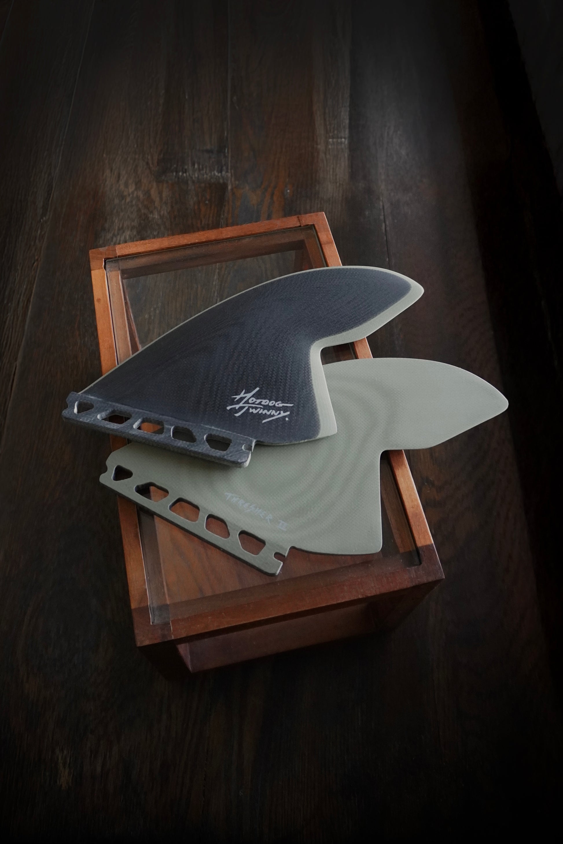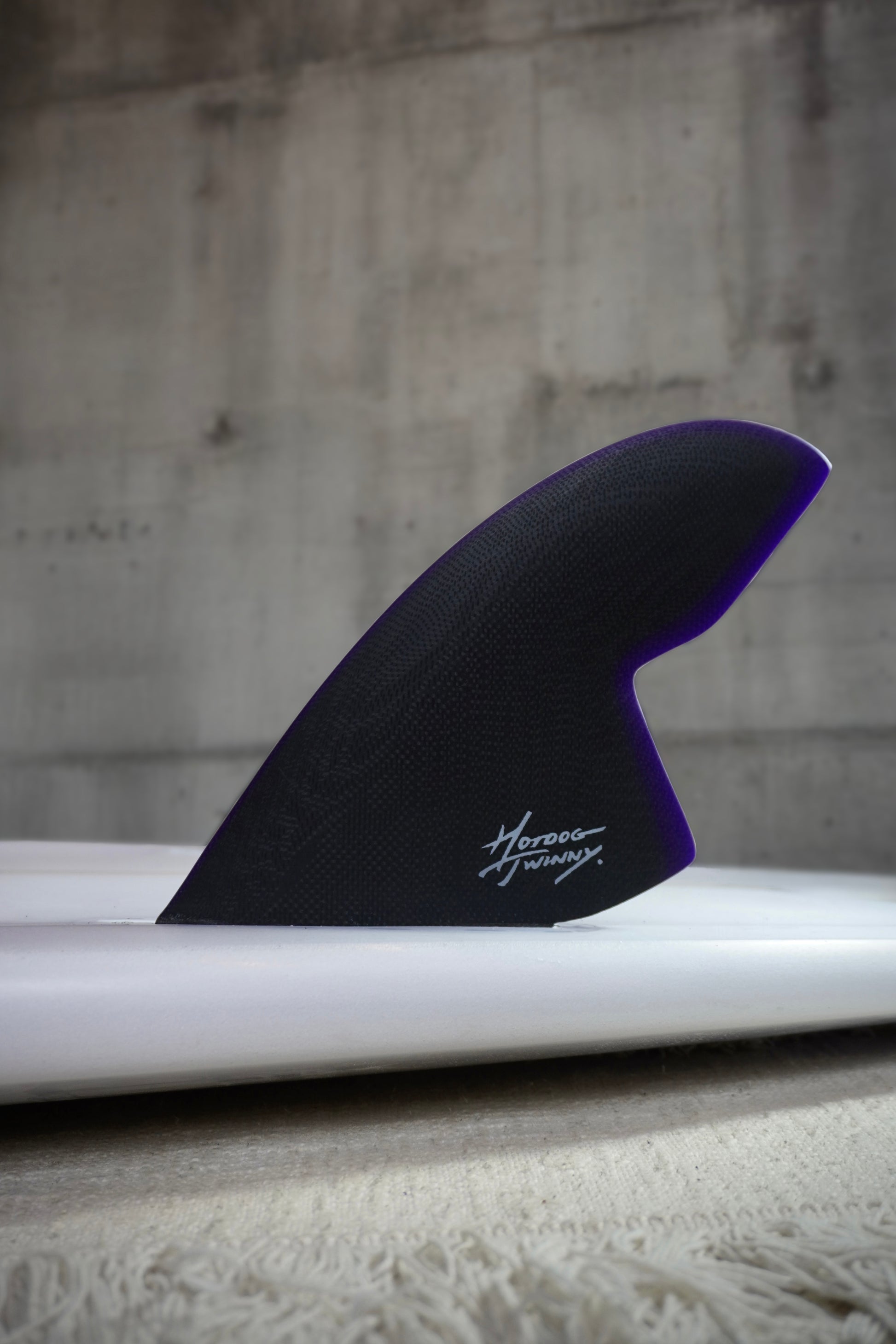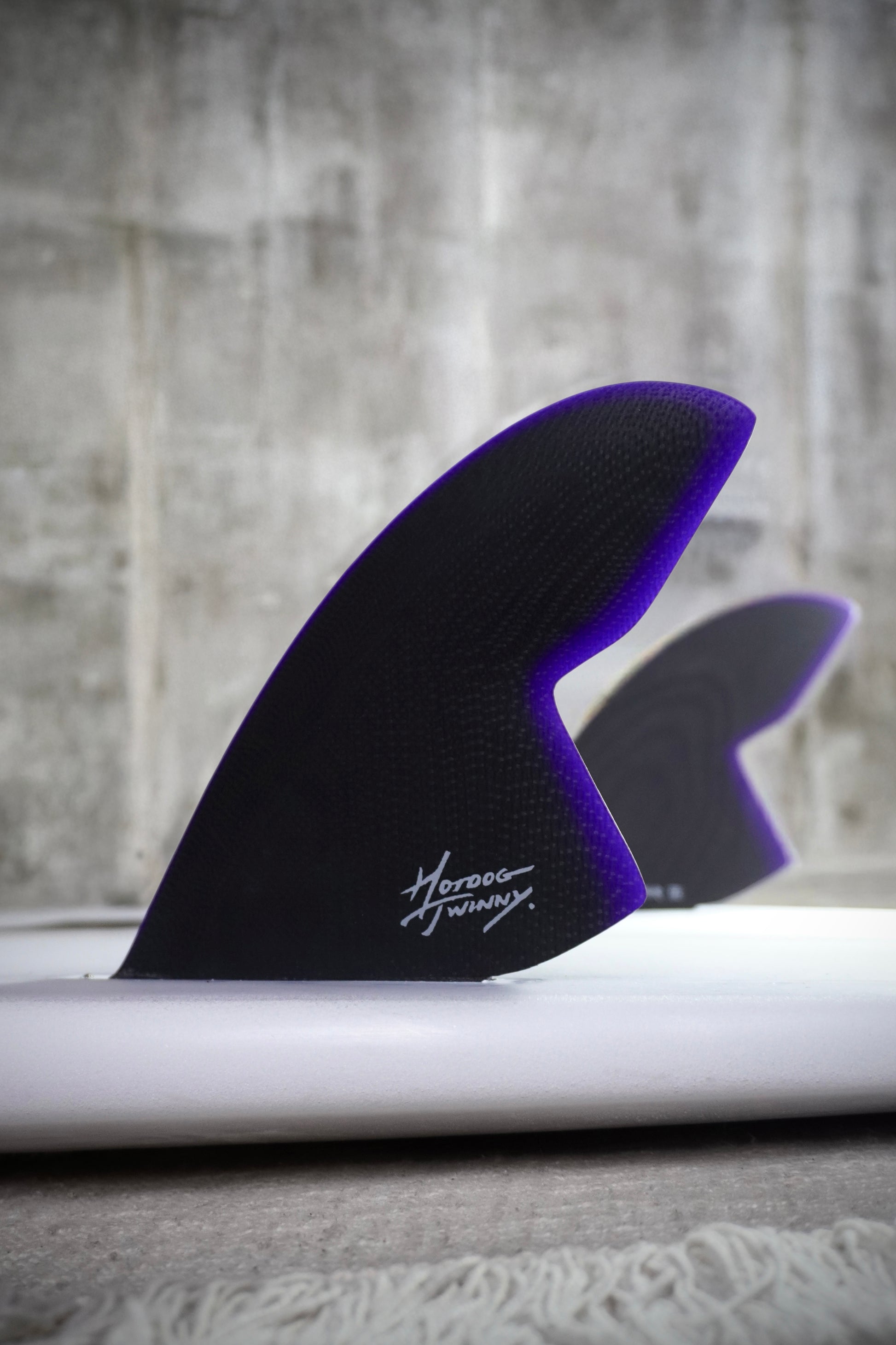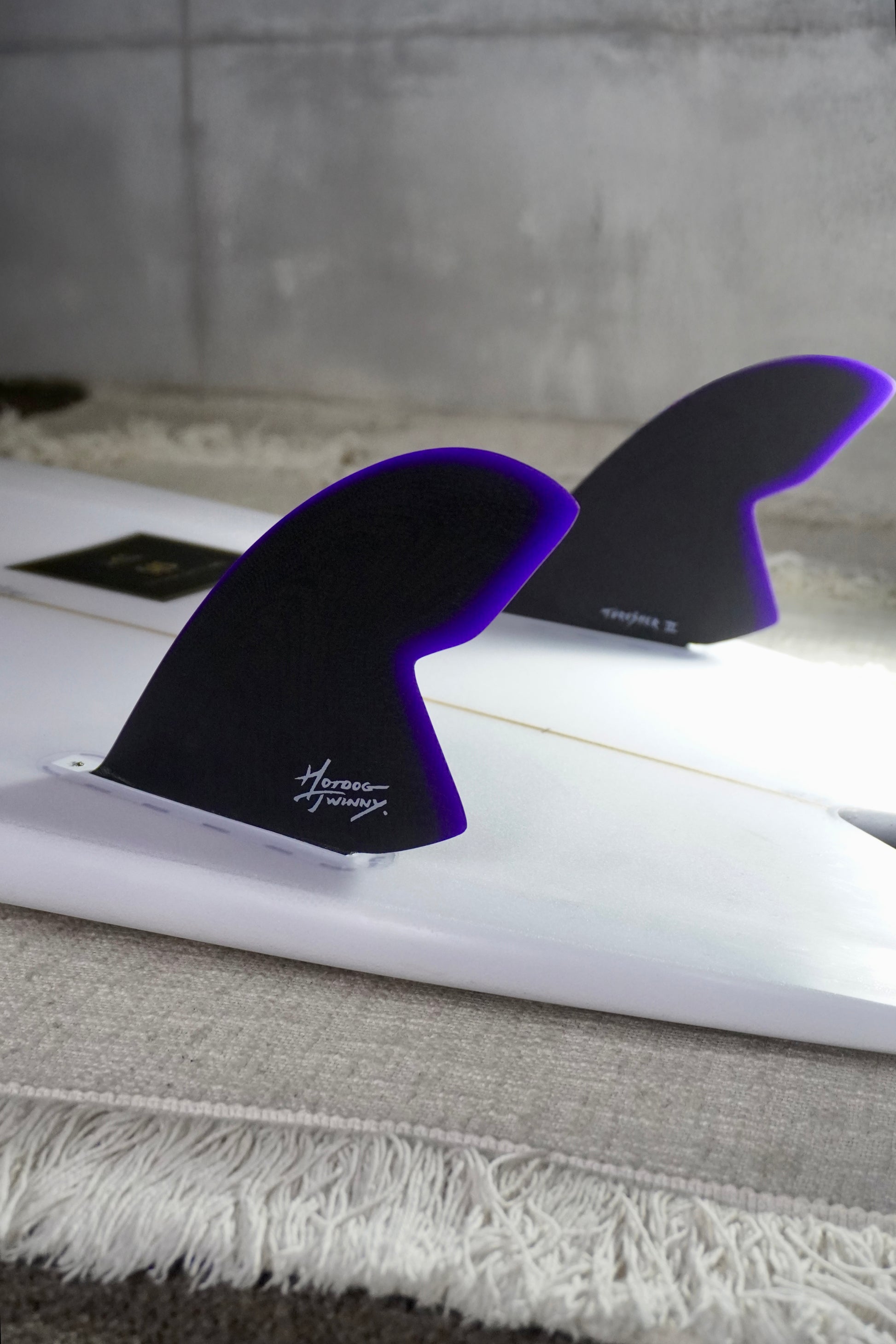 元コンペサーファーでありながらデザイナーとしてのセンスも発揮し、自らの経験をもとに生み出したのがこの HotDog Twinny Fin