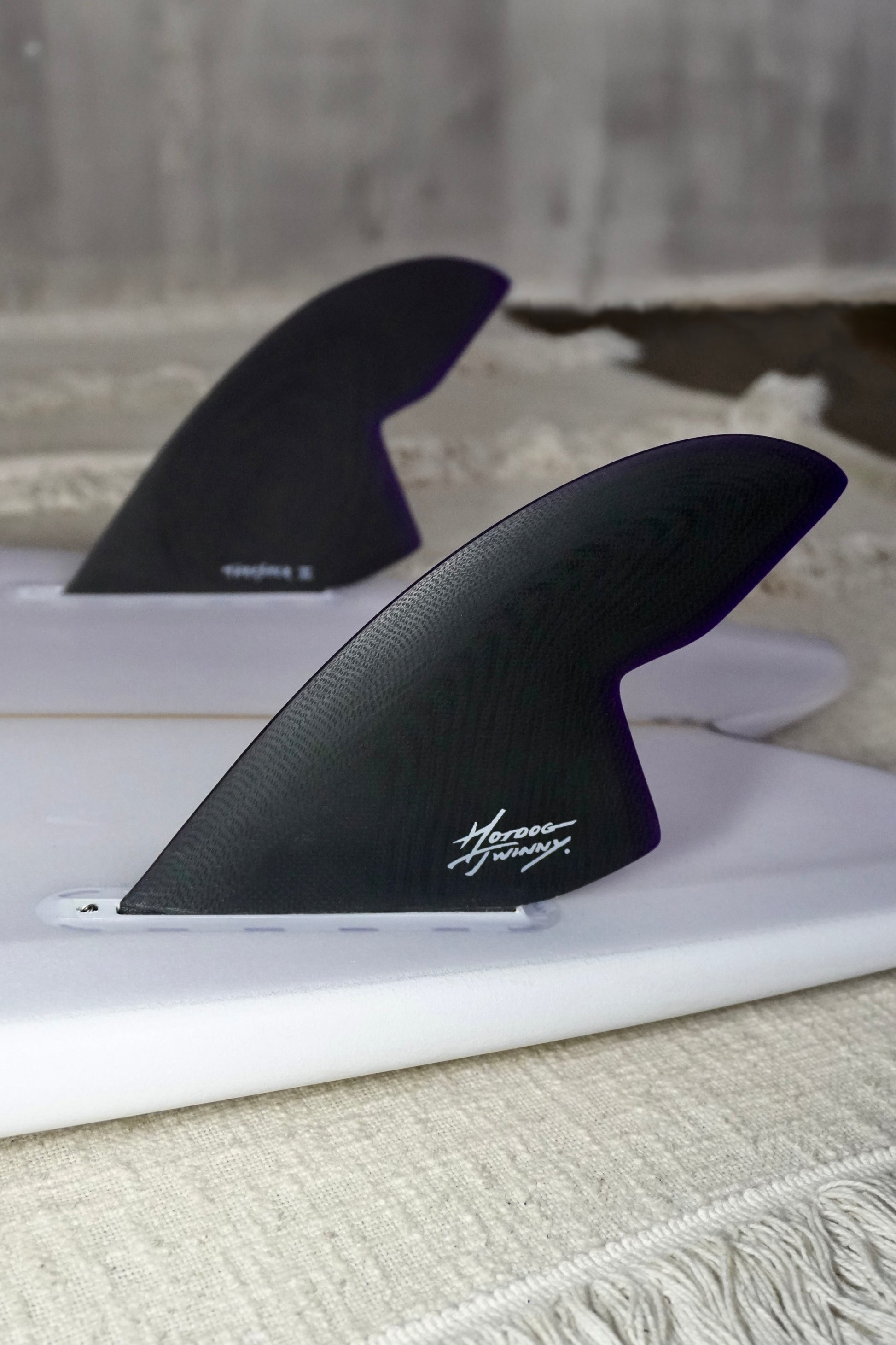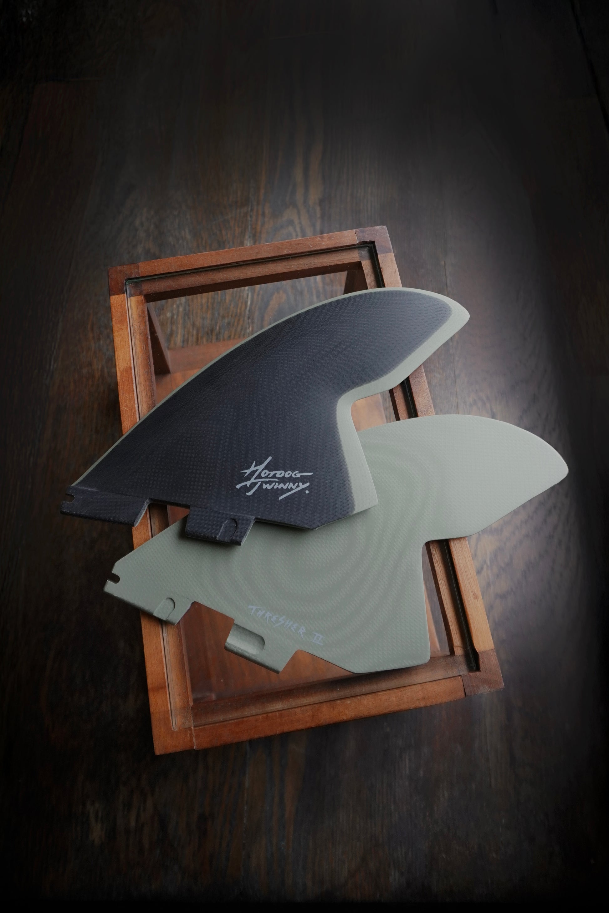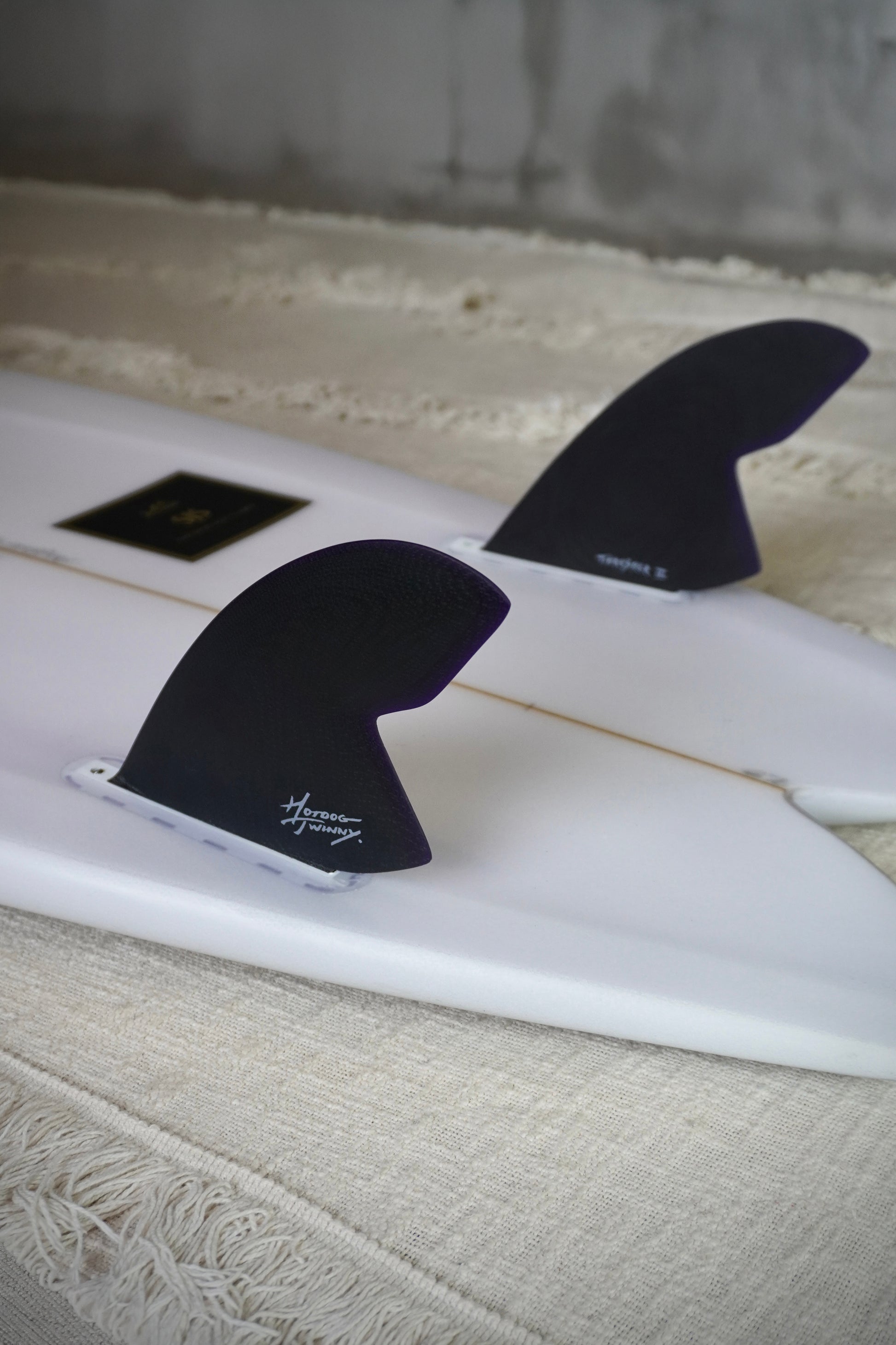 元コンペサーファーでありながらデザイナーとしてのセンスも発揮し、自らの経験をもとに生み出したのがこの HotDog Twinny Fin