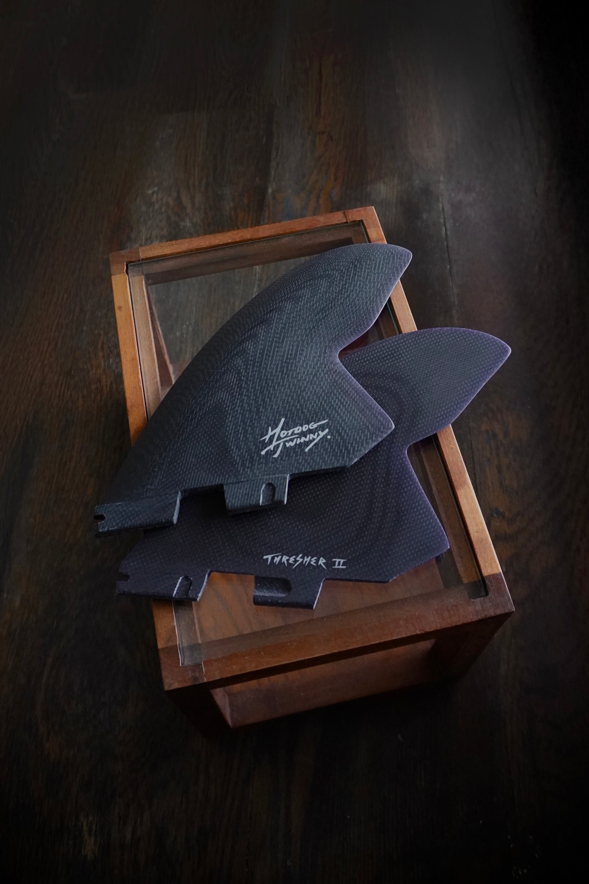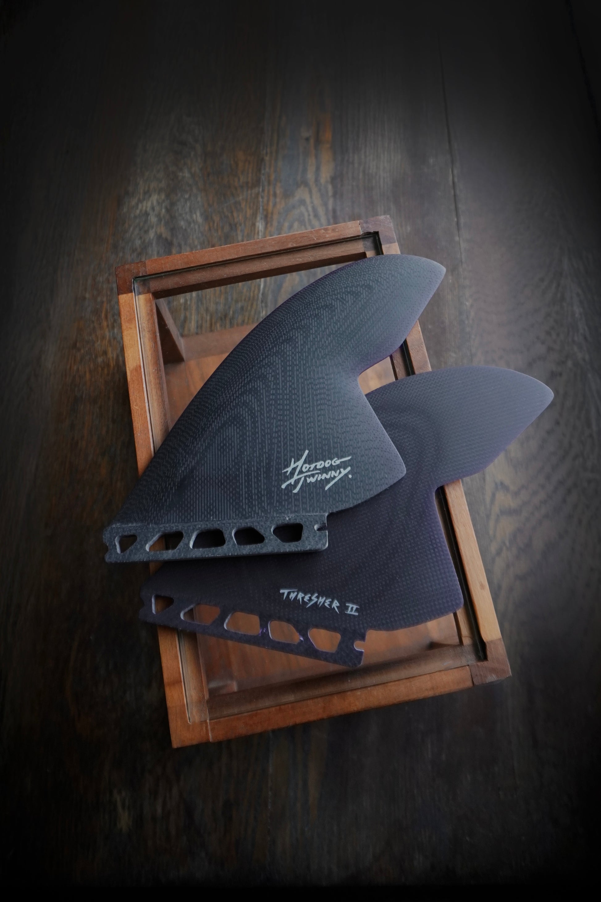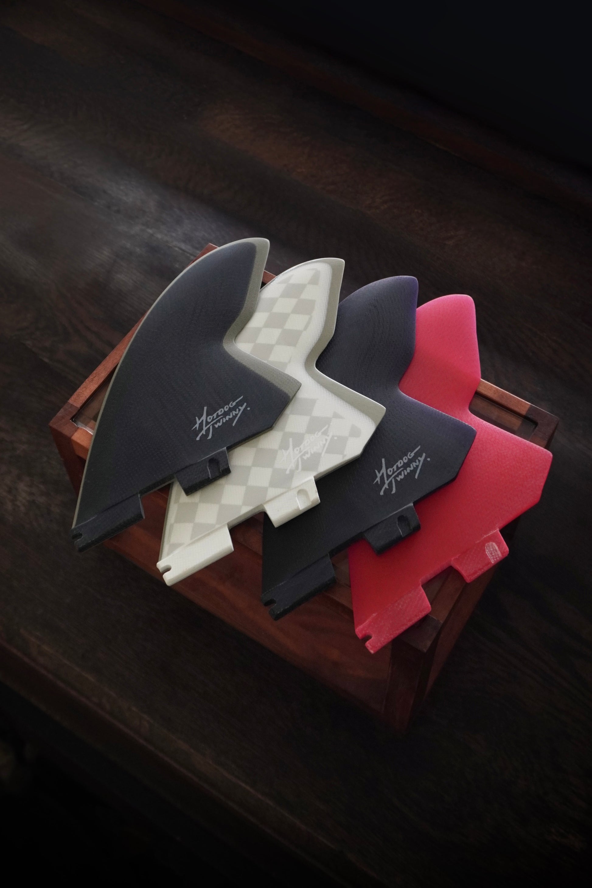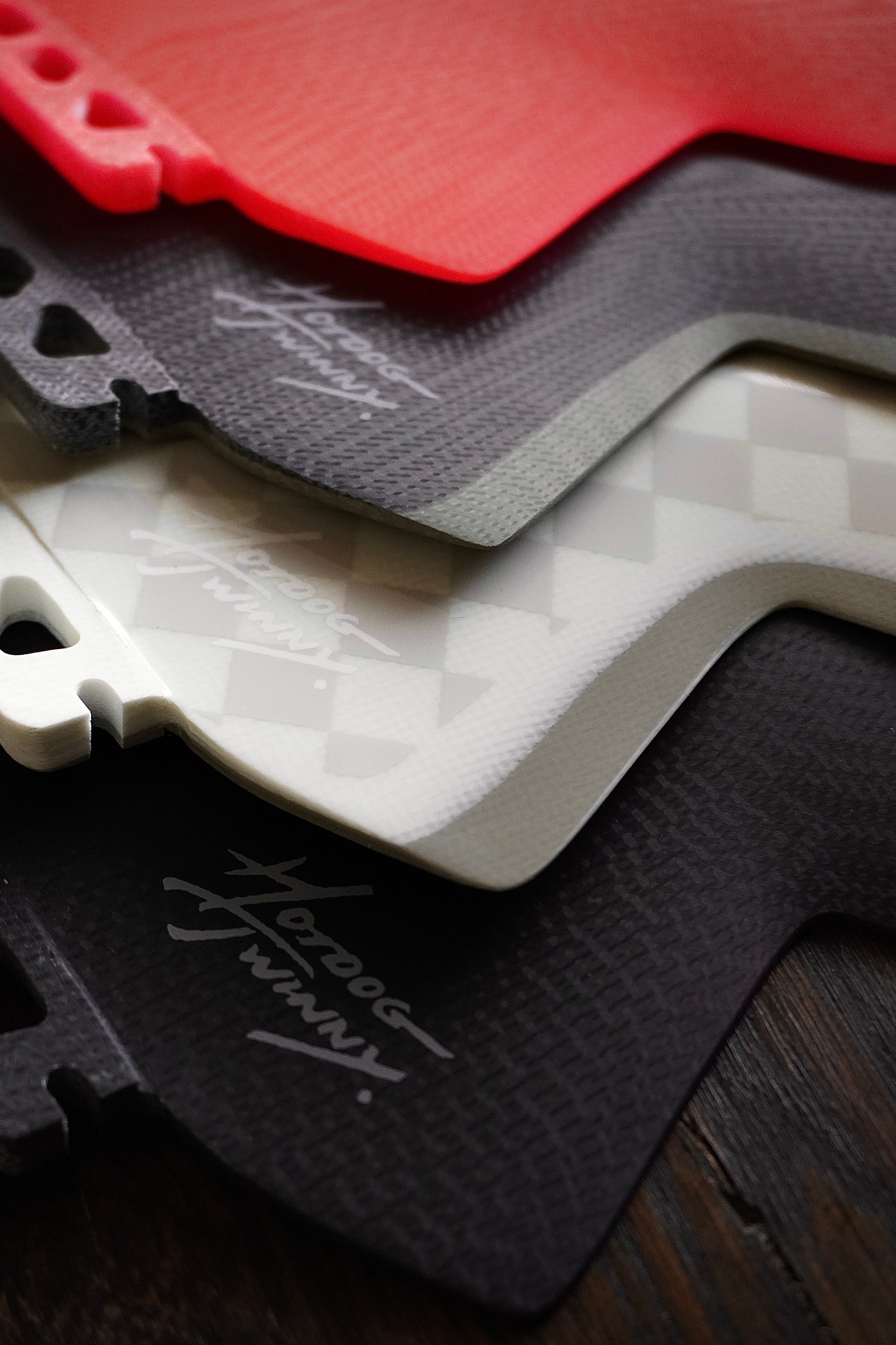 元コンペサーファーでありながらデザイナーとしてのセンスも発揮し、自らの経験をもとに生み出したのがこの HotDog Twinny Fin